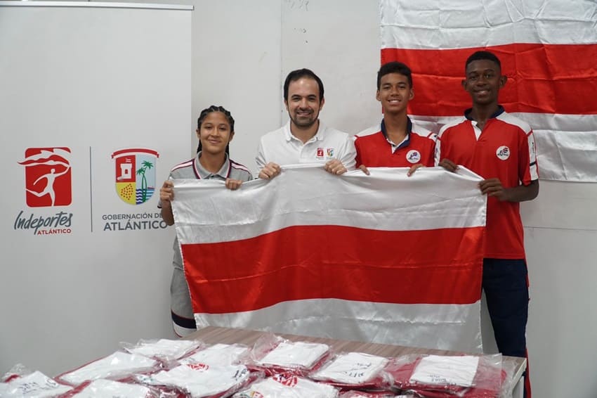 Antes de partir a territorio guajiro, representantes de cada una de las instituciones educativas, docentes y estudiantes recibieron los uniformes y la bandera del departamento por parte del director de Indeportes Atlántico en la sala de juntas del Instituto.