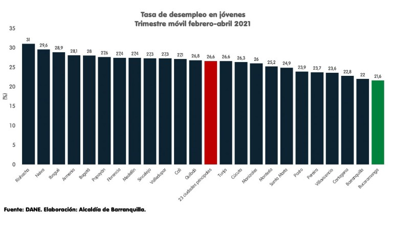 La medición también reflejó que Barranquilla registra la segunda tasa de desempleo juvenil más baja del país (22%), 5 puntos porcentuales por debajo del promedio de las 23 ciudades principales y solo superada por 0,4 puntos porcentuales por Bucaramanga.