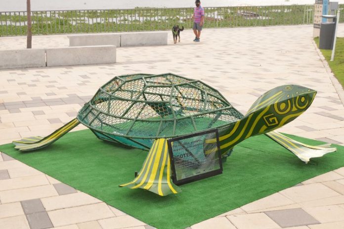 En forma de María Mulata, un ave representativa de la región y de una Icotea, especie en vía de extinción, Triple A instaló en el Gran Malecón de Barranquilla, estas dos grandes canecas destinadas para el depósito de plásticos.
