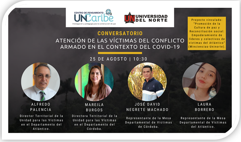 El conversatorio se inscribe en el marco del proyecto “Promoción de la Cultura de Paz y Reconciliación social: empoderamiento de líderes y colectivos de víctimas del Atlántico”, del programa Jóvenes Investigadores e Innovadores del Ministerio de Ciencia y Tecnología en asociación con la Universidad del Norte.
