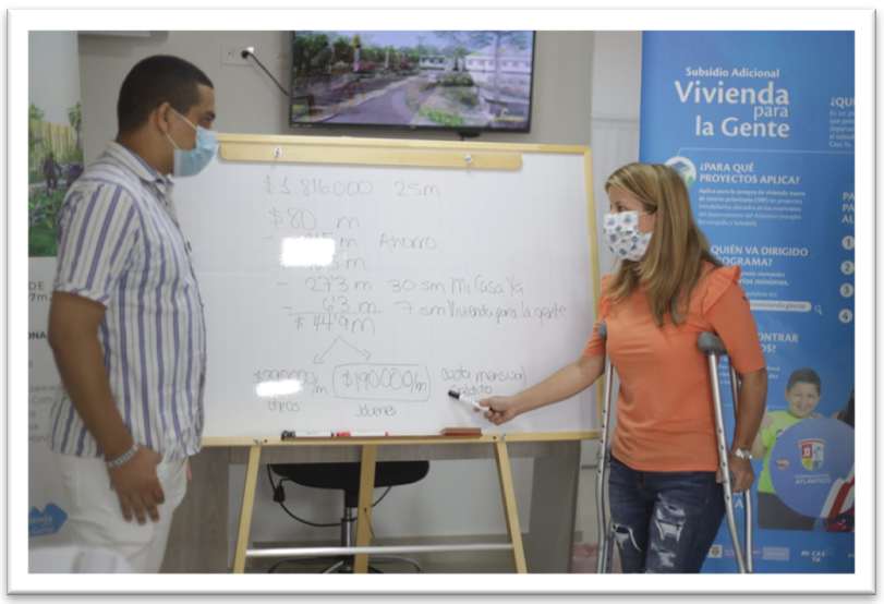 «Hoy estamos en un proyecto hermoso en Sabanalarga, y queremos decirles a todos los jóvenes que ganen menos de dos salarios mínimos, es decir, hasta 1.816.000 pesos, que tienen la oportunidad de comprar una casa en el proyecto Mirador de la Sabana y de acceder a los subsidios del Gobierno Nacional y la Gobernación del Atlántico», indicó la Gobernadora con tablero y marcador en mano.