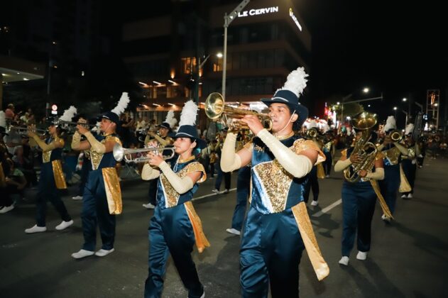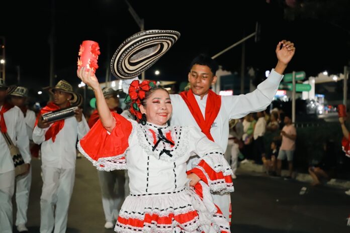 Barranquilla, 16 de febrero de 2025.- La calle 84 vibró con las luces y los ritmos de las cumbias, comparsas y bandas de marcha, que permitieron al público disfrutar de un gran espectáculo cultural en el desfile Noche de Faroles y Tambores, organizado por la Fundación de Arte y Folclor del Atlántico, Fayfa.