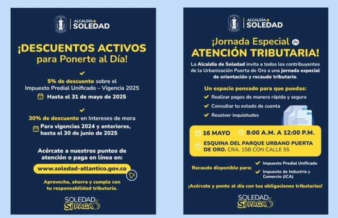 La Alcaldía de Soledad recuerda a la comunidad que actualmente están disponibles descuentos especiales por pronto pago del Impuesto Predial Unificado, por lo que esta jornada representa una excelente oportunidad para ponerse al día y ahorrar.