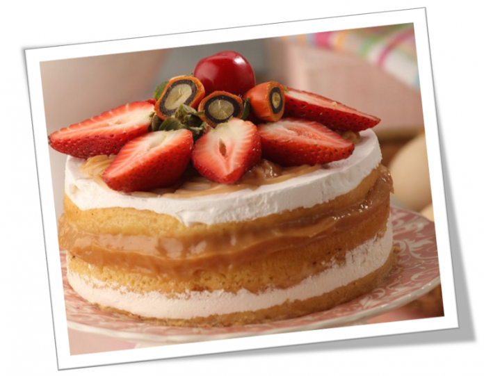 la otra parte de la torta, cubra esta con una capa de arequipe, la otra torta, una capa de crema y otra de arequipe, decore con fresas.