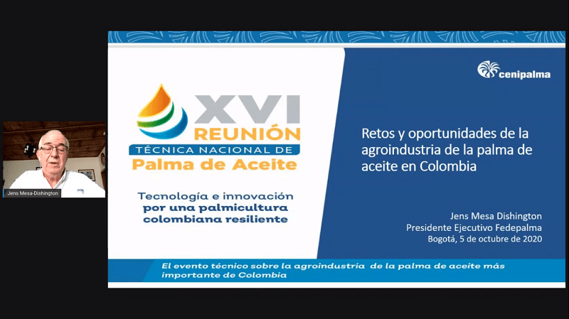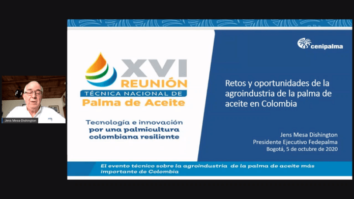 Bogotá, DC.- «En el contexto de los retos y oportunidades de la agroindustria de la palma de aceite, de cara a desarrollar su gran potencial y continuar trabajando por un futuro promisorio, la articulación entre Cenipalma y los palmicultores resulta fundamental y estos últimos  tienen la decisión final de adoptar e implementar los modelos, tecnologías y prácticas”, así lo expuso Jens Mesa Dishington, en el marco de la XVI Reunión Técnica Nacional de Palma de Aceite, que sesiona desde el 5 de octubre y se extiende hasta este viernes 9 de manera virtual.